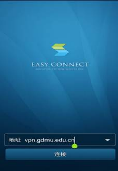 ②打开安装好的EasyConnect客户端,进入VPN登录界面,输入地址vpn.gdmu.edu.cn并点击“连接”。