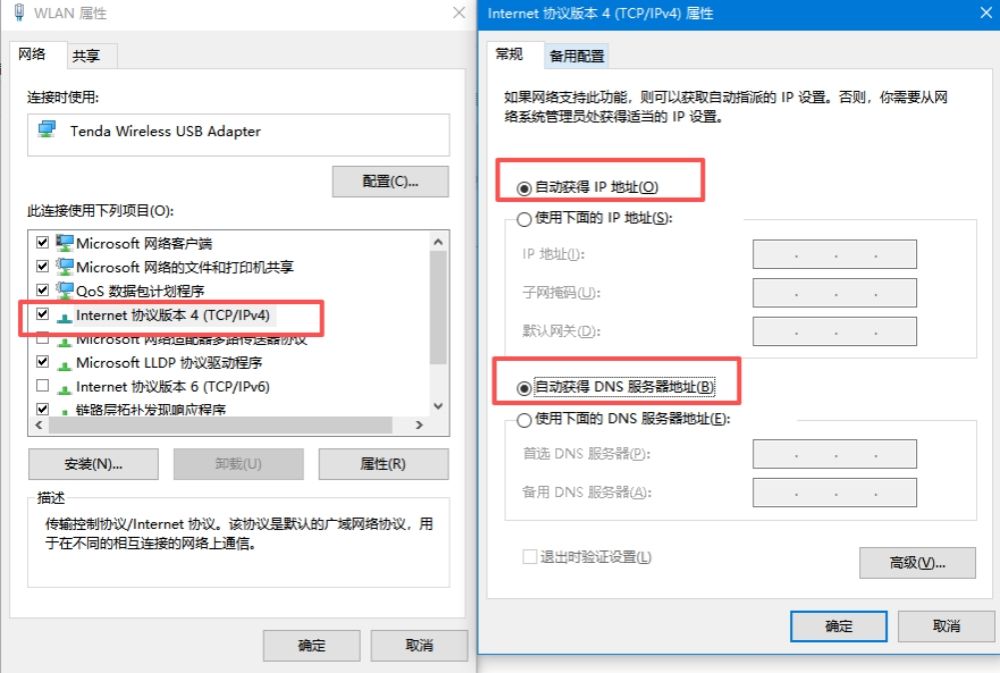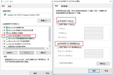 双击“Internet协议版本4(TCP/IPv4)”,选择自动获取IP和自动获取DNS。
