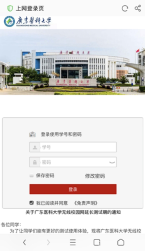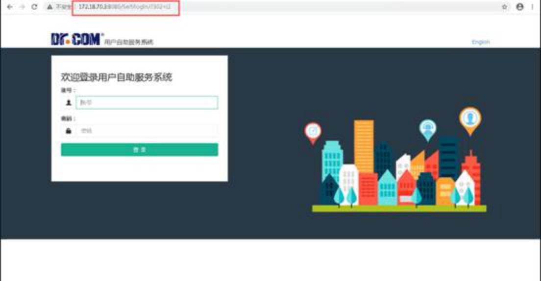 2.在电脑/手机浏览器中,输入自助服务器地址:http://172.18.70.3:8080/Self(东莞),http://202.192.112.152:8080/Self(湛江),请注意字母大小写,输入校园网账号及密码(账号:学号,初始密码:身份证后6位,字母小写)。