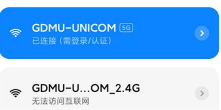 优先选择GDMU-UNICOM这个WiFi连接,如果无法搜索到GDMU-UNICOM或连接后提示“无法接入网络”,说明终端不支持wlan 5G频段,可以前往报装点或联系现场工作人员开启对应宿舍房间wlan 2.4G频段。