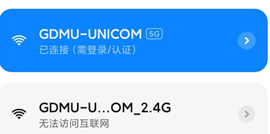 优先选择GDMU-UNICOM这个wifi连接,如果无法搜索到GDMU-UNICOM或连接后提示“无法接入网络”,说明终端不支持wlan 5G频段,可以前往报装点或联系现场工作人员开启对应宿舍房间wlan 2.4G频段。