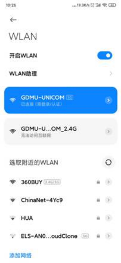 打开手机WiFi,连接SSID:GDMU-UNICOM,打开wlan后,优先选择GDMU-UNICOM这个WiFi连接,如果无法搜索到GDMU-UNICOM或连接后提示“无法接入网络”,说明终端不支持WLAN 5G频段,可以前往报装点或联系现场工作人员开启对应宿舍房间WLAN 2.4G频段。