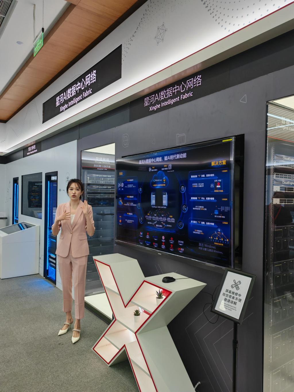 调研组一行先后参观了华为数据通信创新实验室以及企业业务香农展厅。在数据通信创新实验室,讲解员以讲技术干货、提供真实业务体验和动手操作的展示方式,全面呈现当前数据通信的主力方案、明星产品、技术创新、行业应用体验和生态伙伴发展等内容。在企业业务香农展厅,讲解员聚焦企业业务场景,围绕数字站点、智慧园区、广域网络、全栈数据中心等介绍了行业数字化转型以及产品组合解决方案。