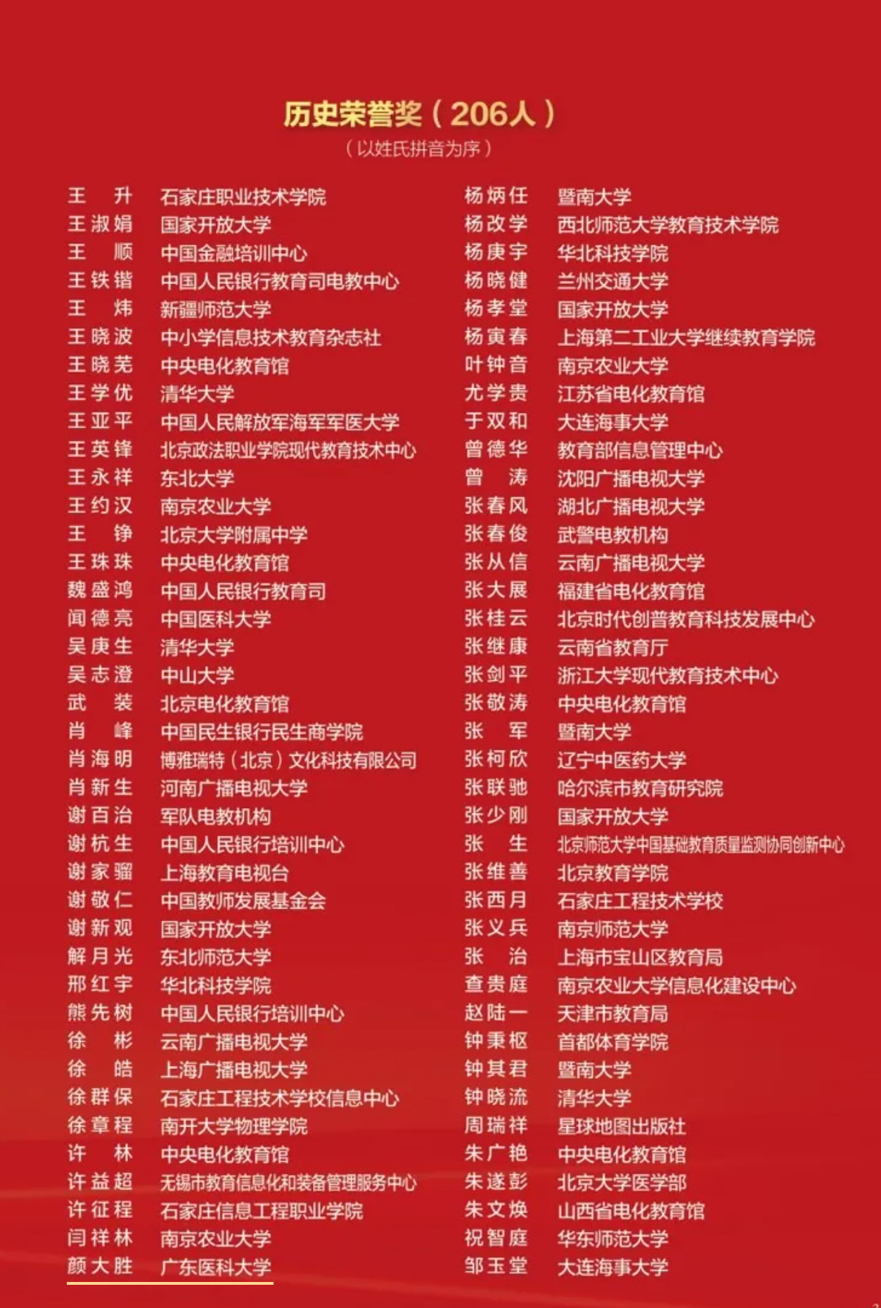 为表彰30年来协会工作先进分子、核心骨干人员不忘初心,努力为教育技术事业奋斗,并取得突出业绩的精神,激励广大会员在新的历史时期更好地做好协会工作,促进全国教育信息化发展,协会公布了一批先进集体和个人名单,包括:“历史贡献奖”8人,“历史荣誉奖”206人,“在会奉献30年纪念奖”247人,“优秀工作者奖”72人,“先进专业委员会奖”24个。我校原副校长颜大胜荣获“历史荣誉奖”,教育技术与信息中心主任陈晓荣获“在会奉献30年纪念奖”。我校原副校长颜大胜多年来一直从事医学教育技术的研究工作,先后历任广东省高校电教研究会副理事长,中华医学会视听教育学会广东分会副主任委员;中华医学会视听教育学会第一届理论学组成员、医学摄影学组副组长,第三、四、五届摄影学组组长,中华医学会教育技术分会委员、常委、副主任委员,候任主任委员、主任委员、前任主任委员,中国教育技术协会常委、医学专业委员会主任委员,《中国医学教育技术》杂志编委。他对医学摄影有较为完整的理论体系建树,共发表论文20多篇;先后承担广东省教育厅教育技术“五个100工程”和“五个一”工程课题项目6项,教育技术研究成果获国家级学会和省厅级教育技术奖20多项次、获广东省科技进步三等奖1项。参与整形外科临床研究,获广东省科技进步二等奖1项,湛江市重大科技进步特等奖1项,厅、局级科技成果奖4项。担任教育技术“十三五”规划教材《医学教育技术教程》副主编;应用教育技术策划开发“五位一体”成人护理本、专科立体教材48部,担任总主编;曾被评为中华医学会教育技术分会先进个人,获中国教育技术协会年度工作成就奖。