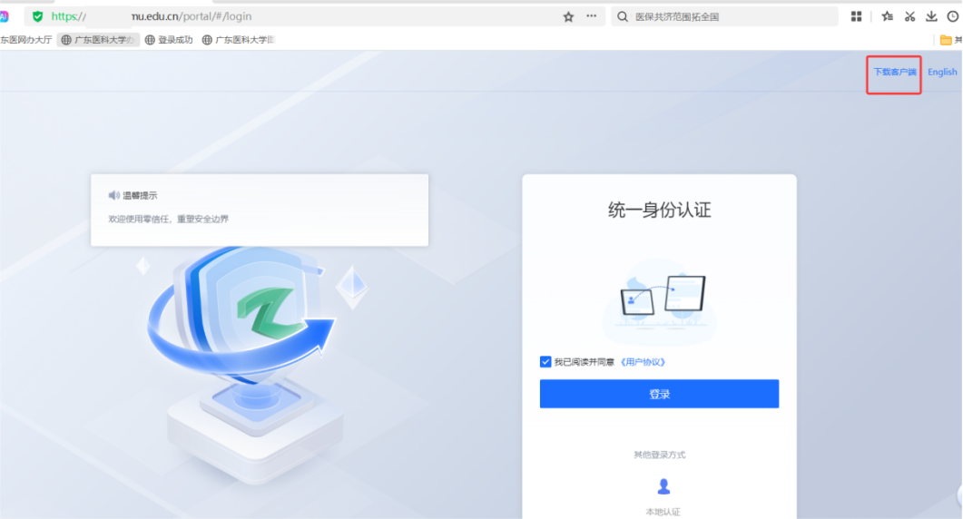 ①电脑端在浏览器里输入https://vpn.gdmu.edu.cn,打开VPN网站,点击右上角“下载客户端”,按提示完成atrust软件安装。