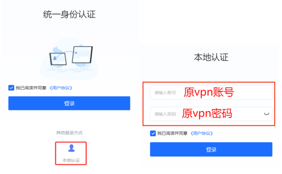 参照上述的下载安装方式完成atrust客户端部署。安装完成后,打开aTrust首页,选择“本地认证”,使用VPN账号和密码进行登录。