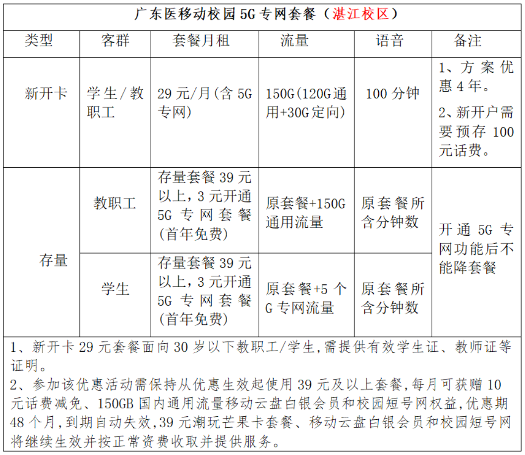 (1)湛江移动联系⼈:黄经理 13702720373,湛江校区5G专网套餐资费如下: