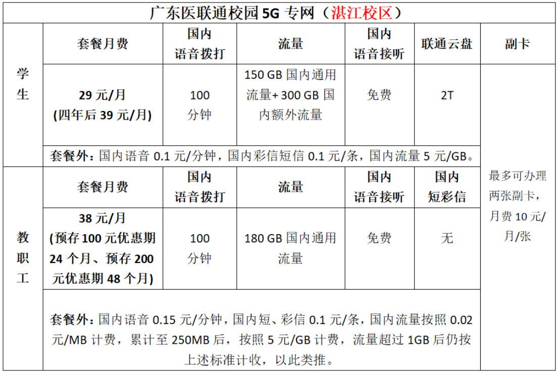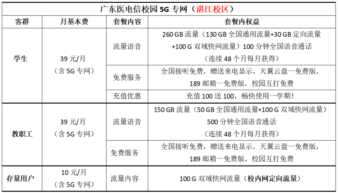 湛江/东莞联通手机用户可申请使用广东医联通校园5G专网服务功能。存量老用户申请5G专网,无需换号换套餐,直接在网办大厅办理申请加入5G专网,服务包费用为1元/月(前两年免费)(注:非湛江/东莞联通号码,暂不能加入专网)。